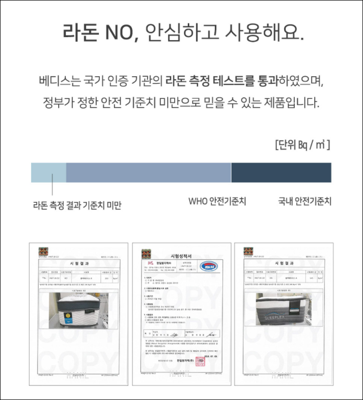 요즘 침대나 매트리스는 라돈이 이슈인데요. 베디스롤매트리스는 베디스 자체적으로 인증기관에서 테스트를 통과하였다고 하니 믿음이 생깁니다. 구매를 원하시는 분들에게 도움이 되셨길 바랍니다. 이상으로 베디스롤매트리스의 제품소개를 마치겠습니다. 지금까지 읽어주셔서 감사합니다.